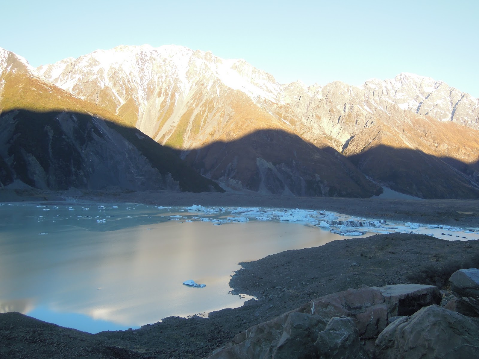 冰河湖被群山環繞,左前方就是庫克山,湖水是綠色的,不過照片中看不清楚。